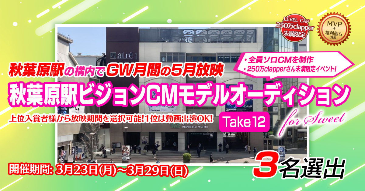 INFO お知らせ 2026.03.22【GW月間の5月放映】【250万Clapper未満限定】秋葉原駅ビジョンCMモデルオーディション Take12 を3月23日よりスイートサイドにて開催! 2026.03.21累計6億7100万Clap!突破!12時間限定ボーナスポイント2.5倍&明日は50%増量 2026.03.15【レベルキャップ無し】5月発売青年コミック雑誌公式広告モデルオーディションを3月16日よりスイートサイドにて開催!(LP対応で10位入賞者まで掲載チャンス有り!) お知らせ一覧 開催中のイベント 一覧へ 新着メディア SWEETBITTERCHERRYSHINYPASSION 羅夢💭 448 まおちゃん 505 emily🐱🍆最新投稿に👏お願い! 302 あんず 69 おなみ¦最新投稿に👏 542 おさかな🏖🌺Rei🐬🦈最新に👏🏻✨️ 664 衣桜ぽぷり 485 もちむぎ👻🌾最新投稿にClap👏🏻 384 高倉の天ちゃん👏感謝🙇♂️ 126 しゅまる🦖🍭 910 しゅまる🦖🍭 5116 おさかな🏖🌺Rei🐬🦈最新に👏🏻✨️ 29946 しゅまる🦖🍭 3532 おさかな🏖🌺Rei🐬🦈最新に👏🏻✨️ 10431 もちむぎ👻🌾最新投稿にClap👏🏻 18002 つるはし 22 しゅまる🦖🍭 3423 たかみや👑 1560 辻岡なぎさ 600 響乃夜空🌙*゚ 10594 にじまる🌈 7264 しゅまる🦖🍭 6415 まふぃん🧸 98 あいりす🐿🍒 849 もっと見る もっと見る -PR- 愛知県名古屋市のシェアスタジオです。様々なコンセプトのブースが20以上!作り込み?大型合わせまで柔軟にご対応致します!ブース写真やご利用規約等は公式サイトからご覧下さい! -PR- コスプレスタジオ『Reve』 新着投稿会員 75BITTER つるはしSWEET YUTOCHERRY もっと見る Tweets by claps_pro