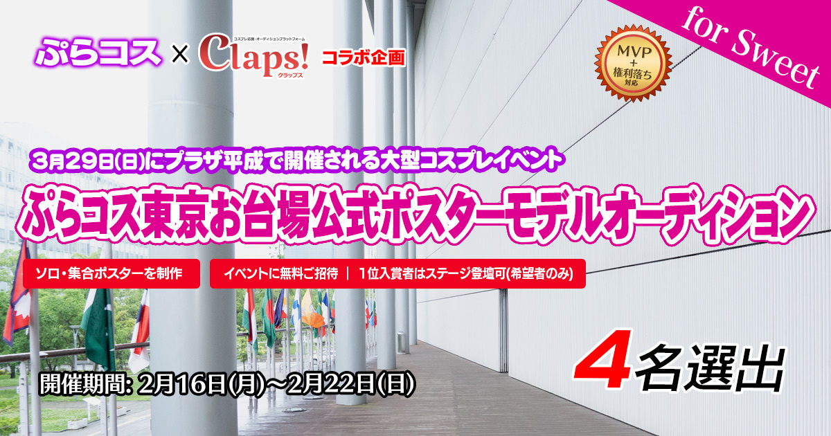 INFO お知らせ 2026.02.15【3月29日開催】「ぷらコス東京お台場」公式ポスターモデルオーディションを2月16日よりスイートサイドにて開催! 2026.02.15累計6億6400万Clap!突破!24時間限定ボーナスポイント2倍キャンペーン! 2026.02.11第344回チャレンジイベント「ハッピーバレンタイン2026」を3ワールドで開催。2月11日(水)~2月15日(日) お知らせ一覧 開催中のイベント 一覧へ 新着メディア SWEETBITTERCHERRYSHINYPASSION かろん 15 おなみ¦最新投稿に👏 0 羅夢💭 267 てんどんまる。 36 霧野🦇最新画像にClap! 251 まひこ 0 りとくん🐬>最新に👏 310 おさかな🏖🌺Rei🐬🦈最新に👏🏻✨️ 1015 紫希茜音 0 辻岡なぎさ 215 海月れいな 25 天音ちか@最新👏お願いします 7142 まおちゃん 2692 🐰うさひめ。🐇🍑@VR販売㊥🍒 611 紫希茜音 107 紫希茜音 0 まおちゃん 1005 おさかな🏖🌺Rei🐬🦈最新に👏🏻✨️ 18891 ゆずれもん 1398 SIMCA(シムカ) 212 もちむぎ👻🌾最新投稿にClap👏🏻 8715 ゆず 109 辻岡なぎさ 1055 にじまる🌈 2907 もっと見る もっと見る -PR- コスプレイモードのオンラインショップが誕生!コスプレ衣装、コスプレサポートグッズ販売の他、コスプレに参考になる記事も無料で読めちゃう! -PR- COSPLAYMODE 新着投稿会員 SIMCA(シムカ)SWEET 霧雲雷牙CHERRY 咲紅ふぁん🐹🤍SWEET もっと見る Tweets by claps_pro