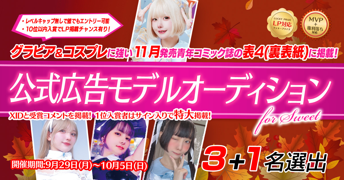 【レベルキャップ無し】11月発売青年コミック雑誌公式広告モデルオーディションを9月29日よりスイートサイドにて開催!(LP対応で10位入賞者まで掲載チャンス有り!)(2025年9月28日)