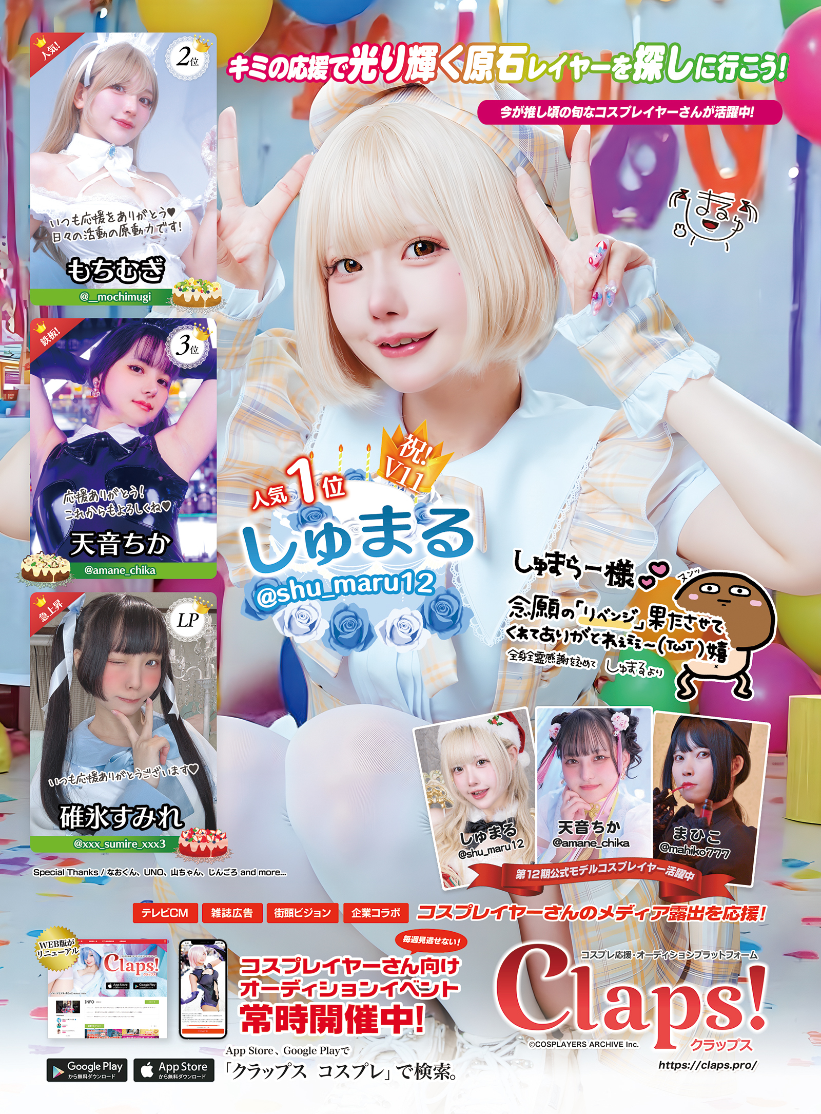 3名+1名を採用。広告モデルとしてコスネームとClaps!ID(Xのスクリーンネームと共通)、ファンへのコメント付きで、同広告内に写真掲載をさせて頂きます。