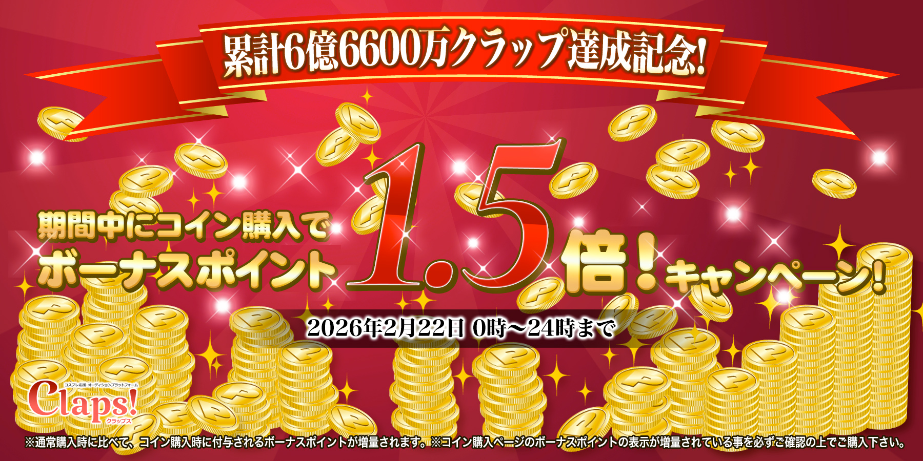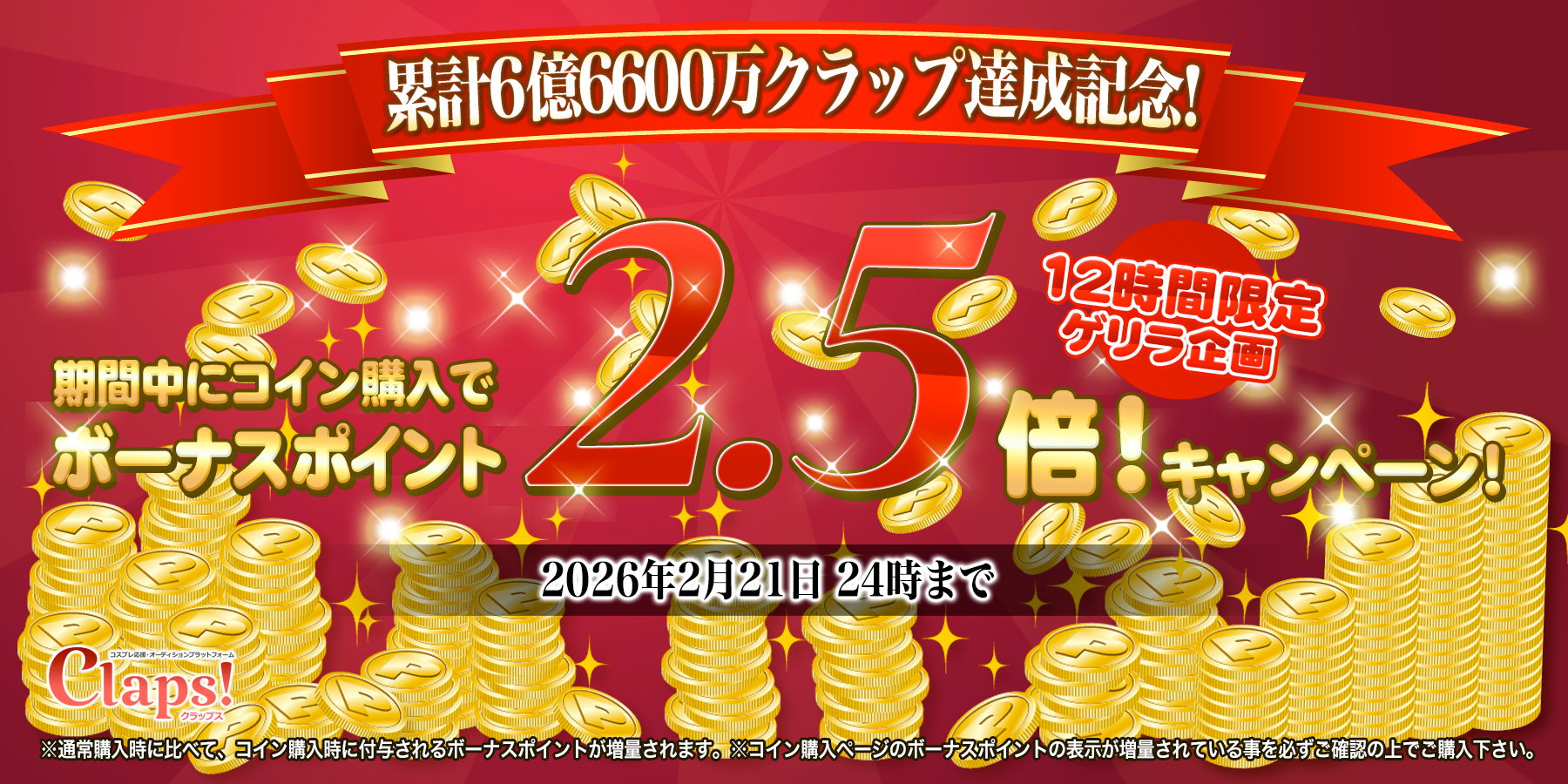 累計6億6600万Clap!突破!12時間限定ボーナスポイント2.5倍&明日は50%増量(2026年2月21日)