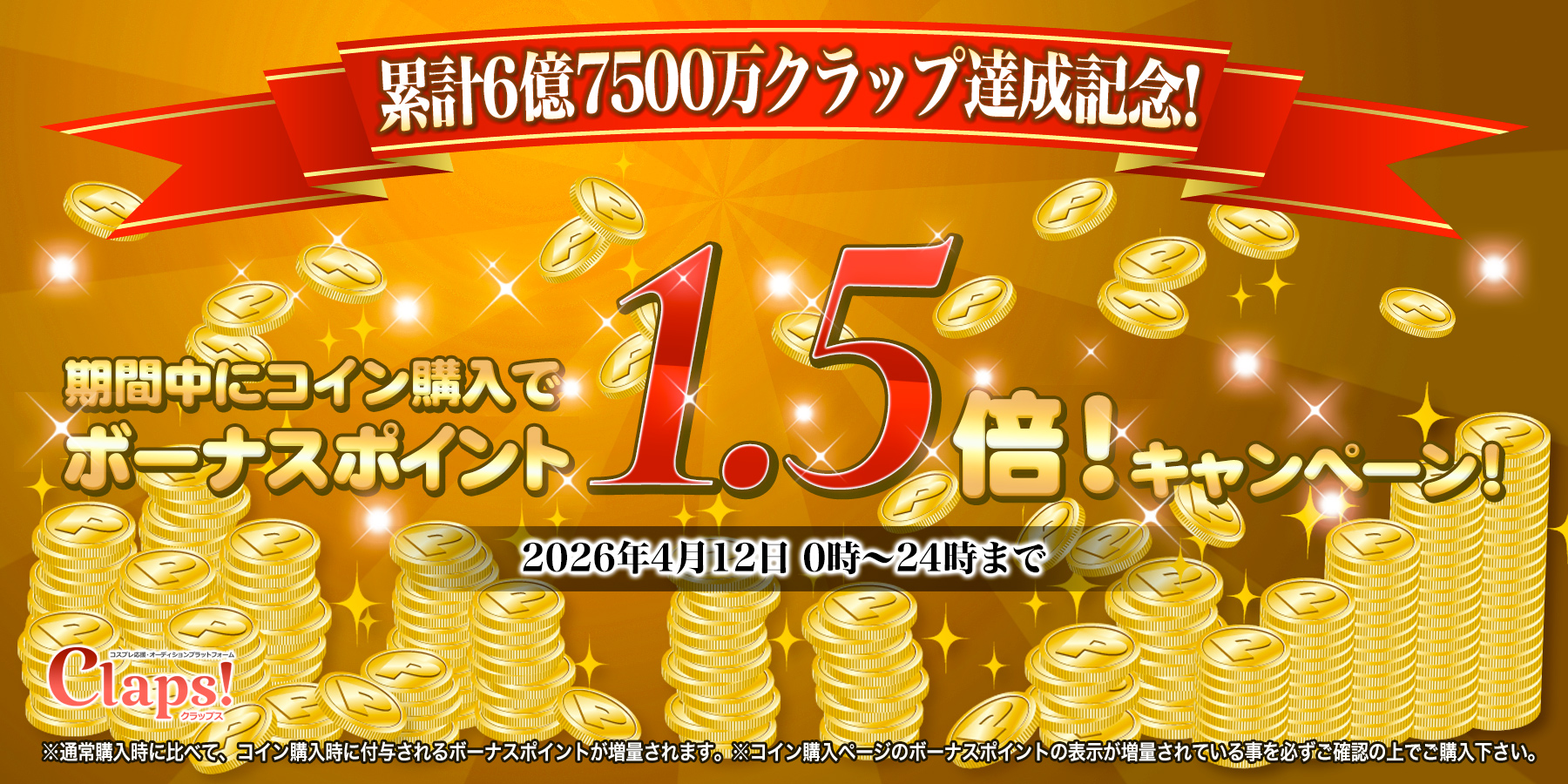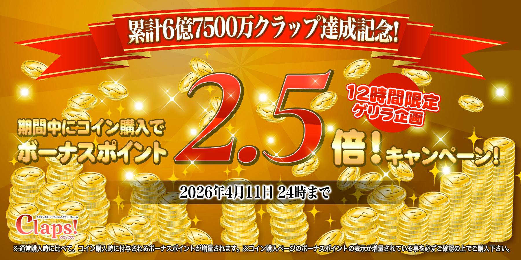 累計6億7500万Clap!突破!12時間限定ボーナスポイント2.5倍&明日は50%増量(2026年4月11日)