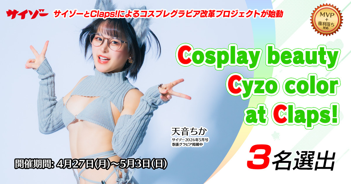 INFO お知らせ 2026.04.24【サイゾー×Claps!によるコスプレグラビア改革プロジェクト】Cosplay beauty Cyzo color at Claps! を4月27日よりスイートサイドにて開催📢 2026.04.19【初心者歓迎】6月発売青年コミック雑誌公式広告モデルオーディションを4月20日よりスイートサイドにて開催!(LP対応で10位入賞者まで掲載チャンス有り!) 2026.04.18累計6億7600万Clap!突破!12時間限定ボーナスポイント2.5倍&明日は50%増量 お知らせ一覧 開催中のイベント 一覧へ 新着メディア SWEETBITTERCHERRYSHINYPASSION 碓氷すみれ🍋 376 神楽ニコル🍬🐿初心者🔰 151 茶々丸 20 つるはし 530 にじまる🌈 2283 無彩 585 ルヰ🌸 336 響乃夜空🌙*゚ 1048 emily🐱🍆最新投稿に👏お願い! 974 羅夢💭 754 辻岡なぎさ 1804 まおちゃん 4215 愛美💘🍀 1841 SIMCA(シムカ) 1271 茶々丸 20 無彩 935 SIMCA(シムカ) 940 海月れいな 258 綾乃森なつめ🩷❤️💚🧡 1470 あいりす🐿🍒 2498 あんず 808 のきく 472 きら星 3412 碓氷すみれ🍋 2855 もっと見る もっと見る -PR- 旬なコスプレアルバイト!アプリの公式パートナーやインフルエンサー、コンパニオン! -PR- 株式会社ミネルバ 新着投稿会員 ネコラッシュBITTER 茶々丸SWEET ココアBITTER もっと見る Tweets by claps_pro