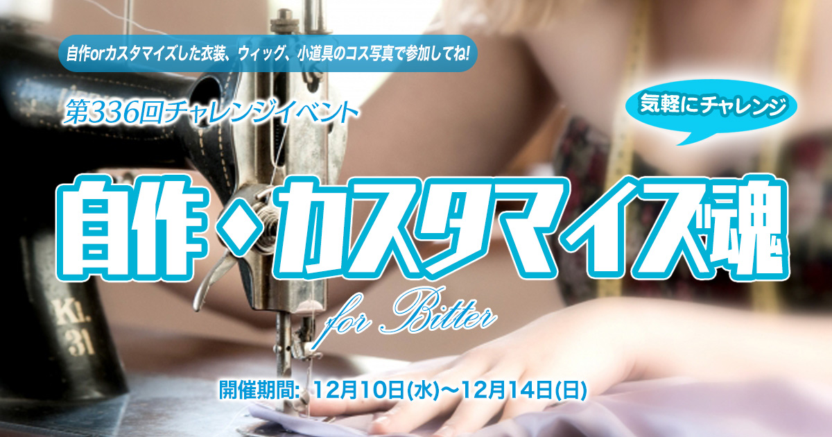 今週のチャレンジイベントでは「自作・カスタマイズ魂」と題して、自作又はカスタマイズした衣装、ウィッグ、小道具を含んだコス写真でエントリーください。